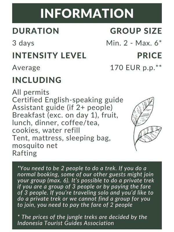 On this unique 3 days jungle trek with Ecotourism Bukit Lawang, you decide! Do you want to explore more of the Sumatran jungle and visit a beautiful waterfall? Or do you prefer a more relaxed experience and would you like to have some more time to chill? The choice is yours! Either way, this jungle trek will give you more chance to spot all the different animals living in Gunung Leuser National Park.