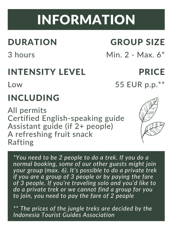 End your jungle trek by walking back to Bukit Lawang or opt for a fun rafting experience on the Bohorok River! Your guide will bring you back to your accommodation around 12-1 pm.