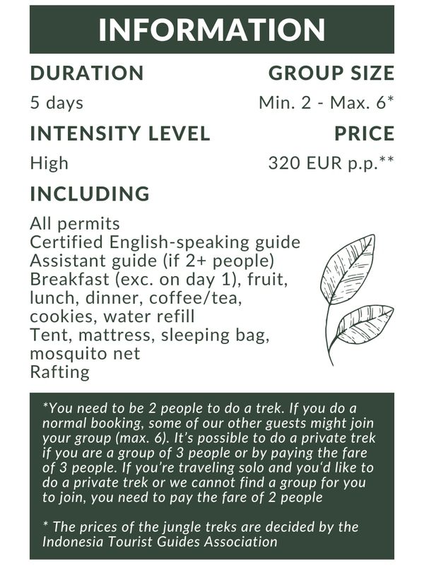 After a delicious breakfast on the last morning of your trek, you get to relax at the campsite and swim in the river. Enjoy a last tasty lunch with a fresh fruit dessert before you head back to Bukit Lawang by rafting. Your guide will bring you back to your accommodation around 2-2.30 pm.